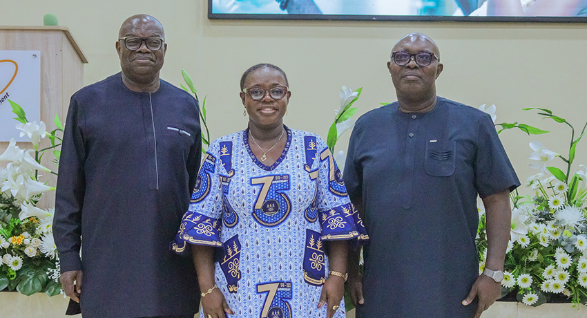 A moment of shared pride — Emeritus Prof. Ernest Aryeetey with Vice-Chancellor Prof. Nana Aba Appiah Amfo and ISSER Director Prof. Robert Darko Osei during the symposium in his honour.